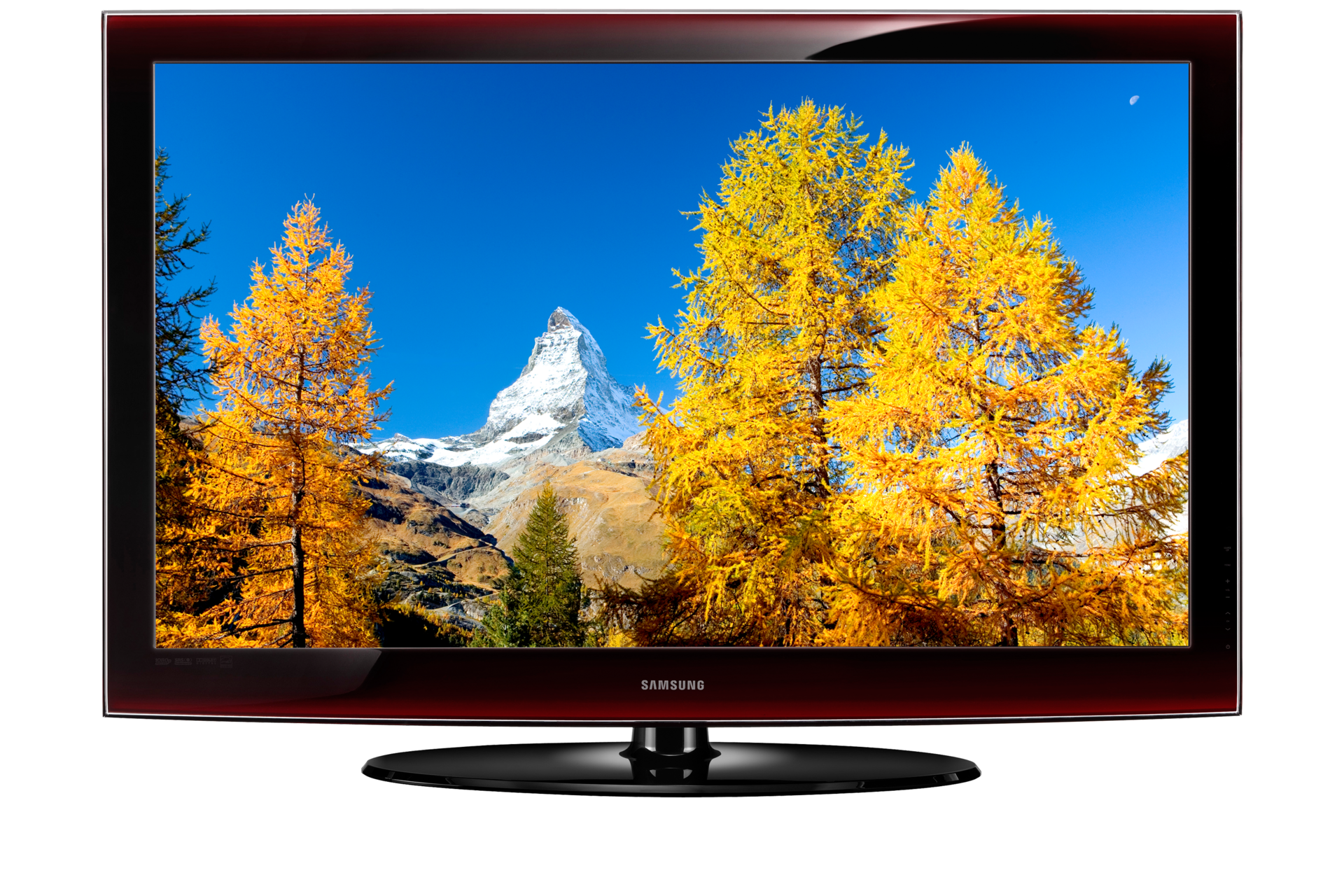 The samsung lcd television features an attached pedestal stand which can also be removed to wall mount the flat panel tv.